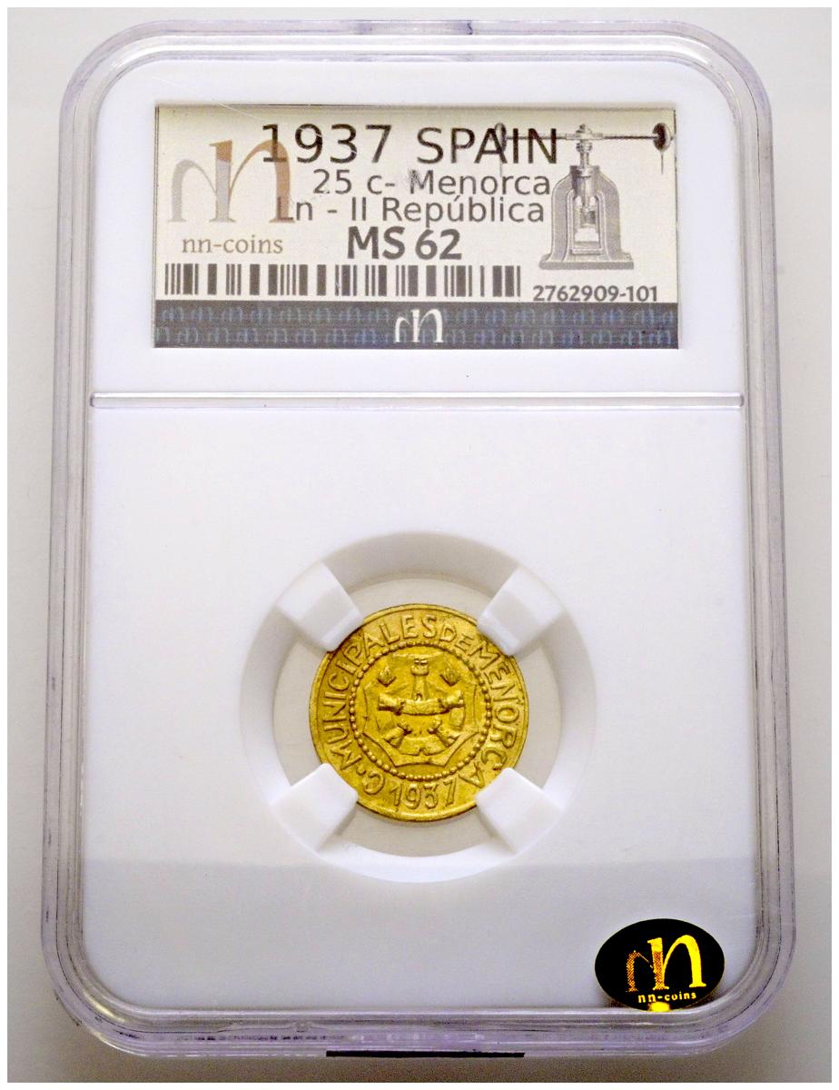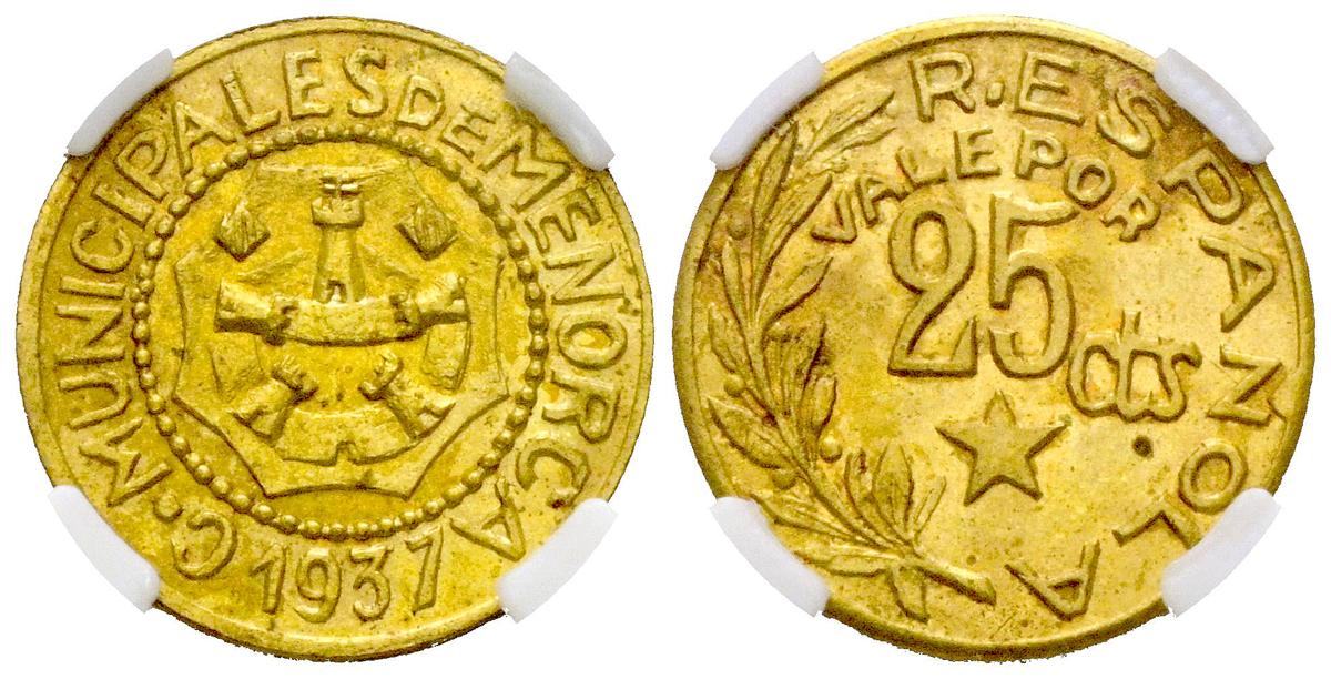 GUERRA CIVIL (1936-1939). Menorca. 25 Céntimos. 1937. (Cal-2019-22). Encapsulado por NN Coins. MS 62.