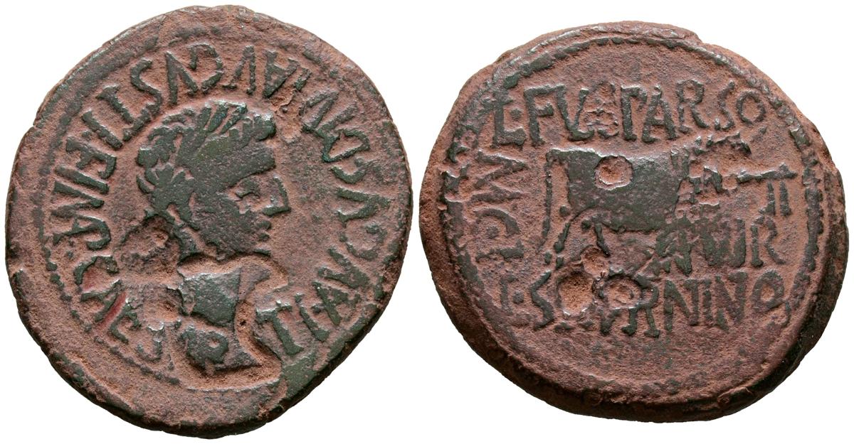 CALAGURRIS (Calahorra, La Rioja). As. (Ae. 12,26g/27mm). 14-36 d.C. (FAB-429). Anv: Cabeza laureada de Tiberio a derecha, alrededor leyenda: TI AVGVS DIVI AVGVSTI F IMP CAESAR. Rev: Toro a derecha, alrededor leyenda: L FVL SPARSO L SATVRNINO II VIR MCI. MBC-. Resello de cabeza de águila en anverso.
