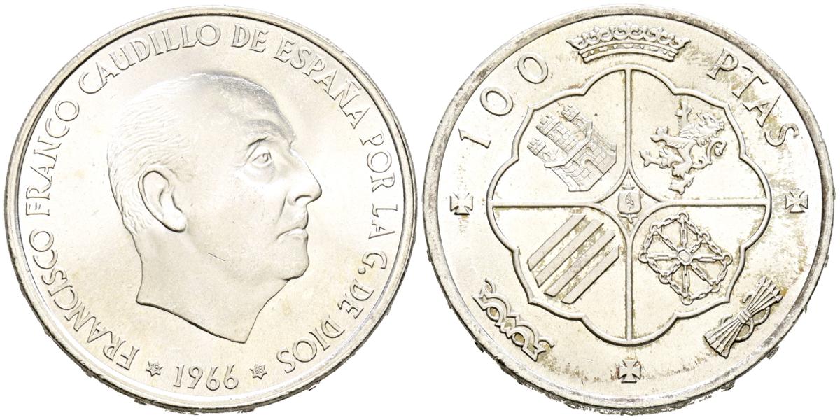 ESTADO ESPAÑOL (1936-1975). 100 Pesetas. (Ar. 19,03g/34mm). 1966 *19-68. Madrid. (Cal-2019-147). SC. Precioso brillo.