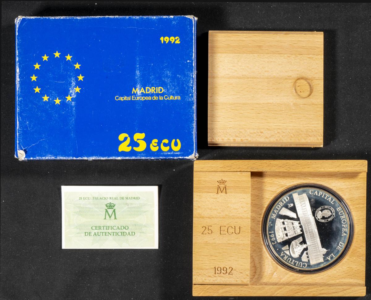 JUAN CARLOS I (1975-2014). 25 Ecu. (Ar. 168,75g/73mm). Madrid Capital Europea de la Cultura. 1992. FNMT. FDC. Incluye estuche original y certificado de autenticidad. Tirada de 15.000 unidades.