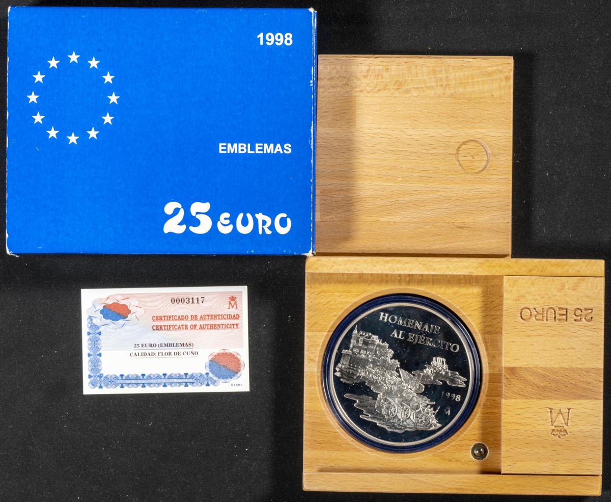 JUAN CARLOS I (1975-2014). 25 Euro. (Ar. 168,75g/73mm). Emblemas. 1998. FNMT. FDC. Presentada en estuche oficial y con certificado de autenticidad. Sólo 10 mil unidades emitidas.