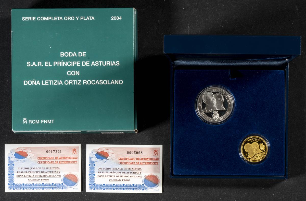 JUAN CARLOS I (1975-2014). Boda Real Príncipe Felipe y Doña Letizia Ortiz. Serie Completa. 2 valores: 200 Euros en oro (1) y 10 Euros (2) en plata. 2004. FNMT. PROOF. Incluye estuche original y certificados de autenticidad.