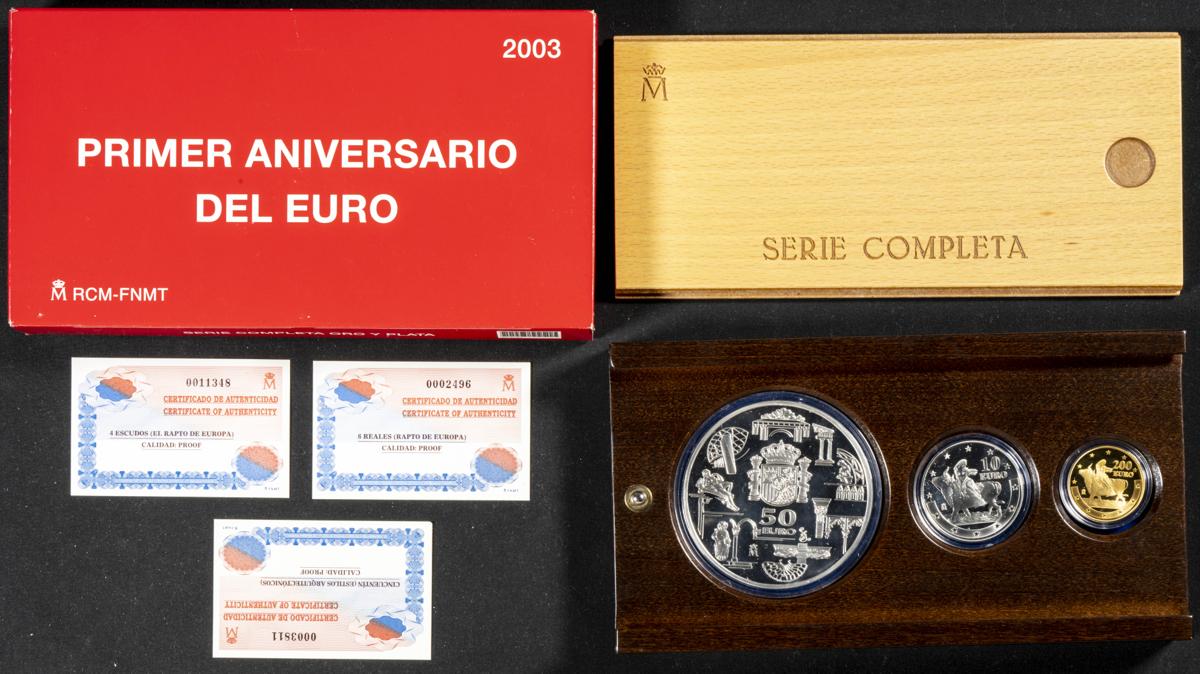 JUAN CARLOS I (1975-2014). Primer Aniversario del Euro. Serie Completa. 3 valores: 200 Euros en oro (1), 50 Euros (1) y 10 Euros (1) en plata. 2003. FNMT. PROOF. Incluye estuche original y certificados de autenticidad.