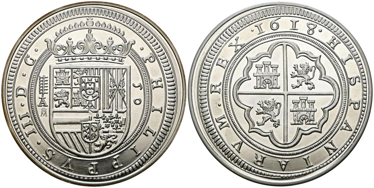 Cinquentín o 5 Onzas (Ar. 169,70g/72mm). 1618. Felipe IV. Reproducción moderna en plata de 0,925 milésima de la serie Historia de la Moneda española. FNMT. SC. Incluye cápsula.
