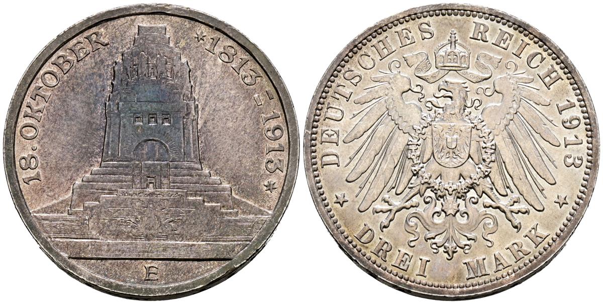 ALEMANIA. 3 Mark (Ar. 16,63g/33mm). 1913. Friedrich August III (último Rey de Sajonia). Muldenhutten E. Centenario de la Batalla de Leipzig. (Km#1275). EBC-. Preciosa pátina.