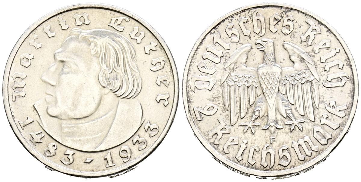 ALEMANIA. 2 Reichsmark (Ar. 8,03g/25mm). 1933. Sttutgart. Aniversario del nacimiento de Martín Lutero. (Km#79). EBC-.