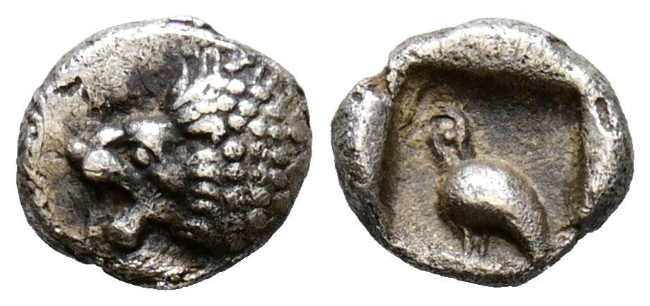 CARIA, Mylasa. Tetartemorion. (Ar. 0,25g/6mm). 420-390 a.C. (SNG Kayhan 940-3). Anv: Cabeza de león a izquierda. Rev: Pájaro estante a izquierda dentro de cuadrado incuso. MBC+.