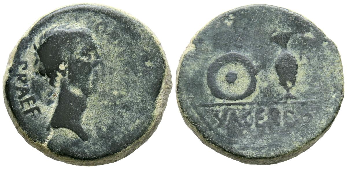 CARTAGONOVA (Cartagena, Murcia). Semis. (Ae. 7,70g/21mm). 27 a.C.-14 d.C. (FAB-587). Anv: Cabeza de Agripa a derecha, alrededor leyenda: CN STATI LIBO PRAEF. Rev: Pátera y preferículo, debajo de línea leyenda: SACERDOS. BC+.