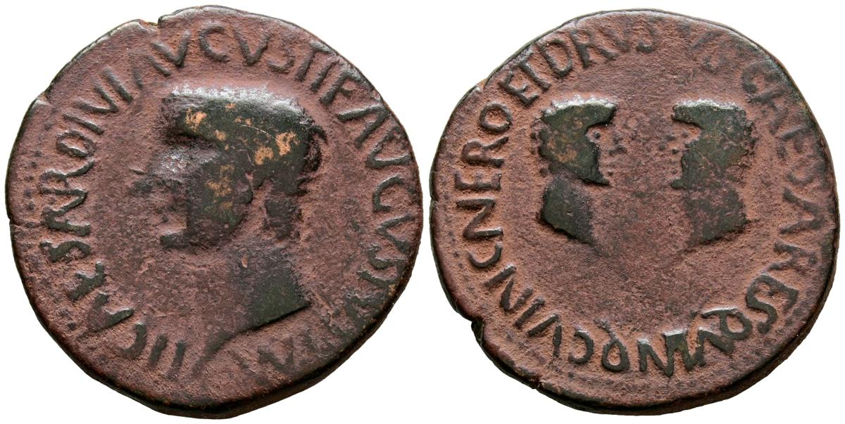 CARTAGONOVA (Cartagena, Murcia). As. (Ae. 15,46g/30mm). 14-36 d.C. (FAB-600). Anv: Cabeza de Tiberio a izquierda, alrededor leyenda: TI CAESAR DIVI AVGVSTI F AVGVSTVS. Rev: Cabezas enfrentadas de Nero y Druso, alrededor leyenda: NERO ET DRVSO CAESARES QVINQ C V I N C. MBC-.