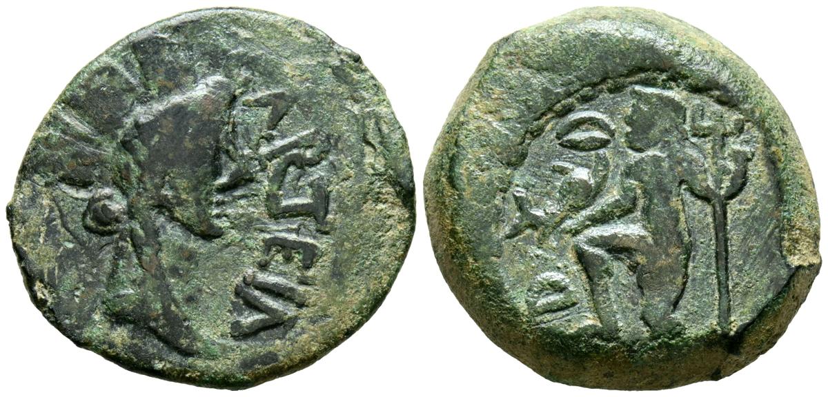 CARTEIA (San Roque, Cádiz). Semis. (Ae. 8,04g/23mm). 27 a.C.-14 d.C. (FAB-662). Anv: Cabeza femenina con corona mural, delante: CARTEIA, detrás tridente. Rev: Neptuno a izquierda portando tridente, delante DD. MBC.