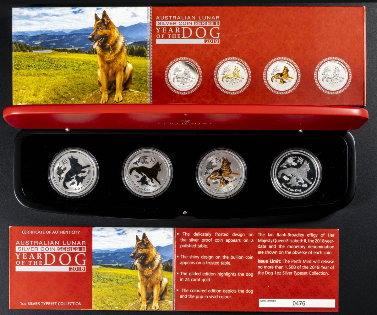 AUSTRALIA. Set oficial y completo de la Serie Australian Lunar Silver Coin. 2018. Año del Perro. El set incluye 4 monedas de plata pura (tipo onza) con acabados diferentes: PROOF, coloreado y dorado. Magnifico estado de conservación. Tirada de sólo 1500 sets.