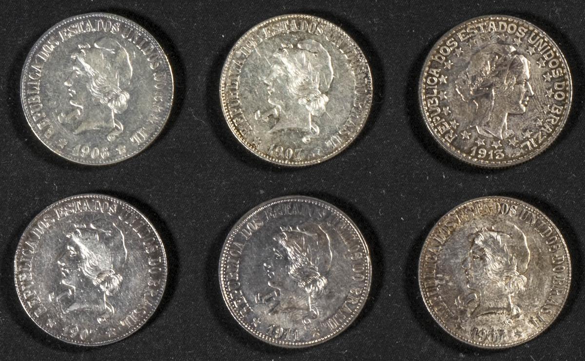 BRASIL. Conjunto de 6 monedas de 2000 Reis en plata acuñadas entre 1906 y 1913. Diferentes estados de conservación. A EXAMINAR.