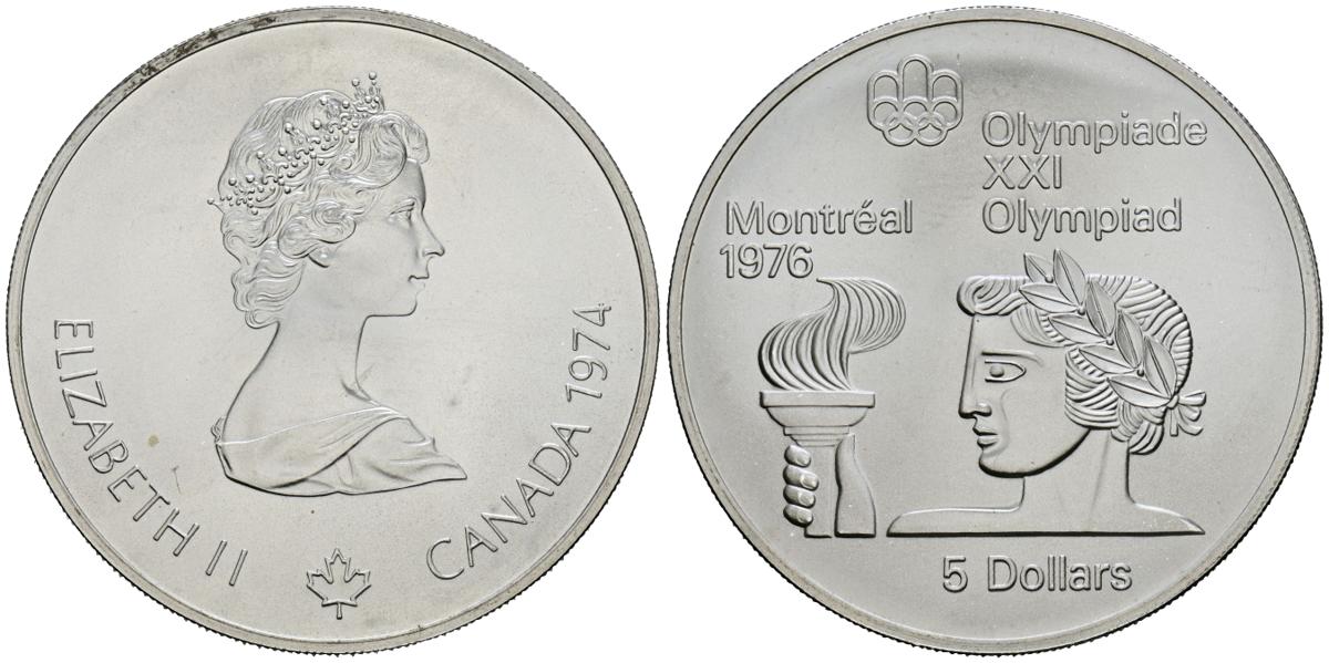 CANADÁ. 5 Dollars. (Ar. 24,25g/38mm). 1974. Juegos Olímpicos de Montreal´76. Atleta con antorcha. (Km#90). SC.