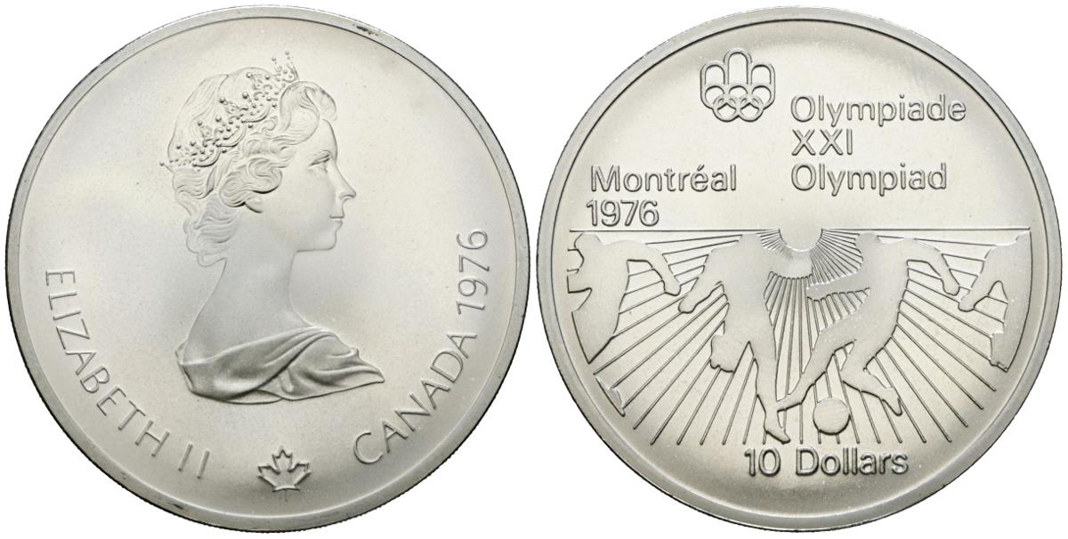 CANADÁ. 10 Dollars. (Ar. 49,24g/45mm). 1976. Juegos Olímpicos de Montreal´76. Fútbol. (Km#111). SC.