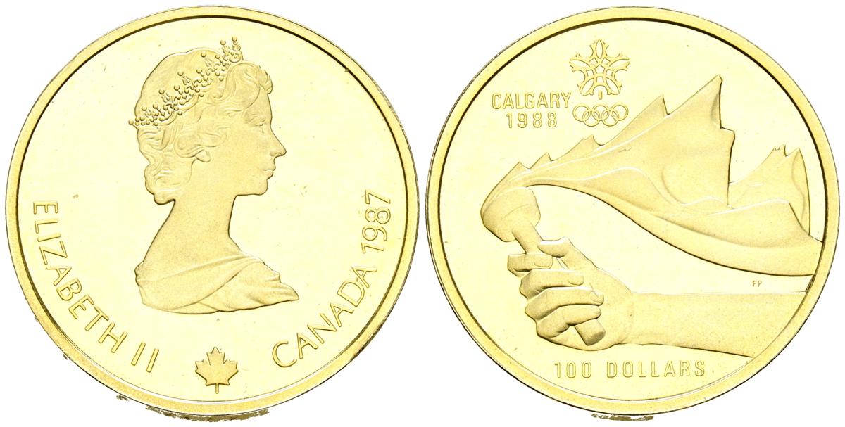 CANADA. 100 Dollars (Au. 13,35g/27mm). 1987. Isabel II. Juegos de Invierno de Cagliari 88. (Km#158). Oro de 0,583 milésimas. PROOF.