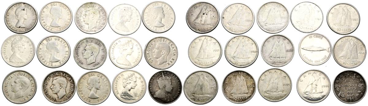 CANADÁ. Bonito conjunto formado por 15 monedas de 10 Cents acuñadas entre 1902 y 1968. Ninguna pieza repetida. Diferentes estados de conservació. A EXAMINAR.