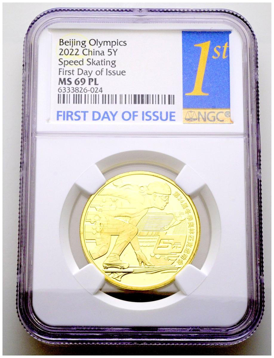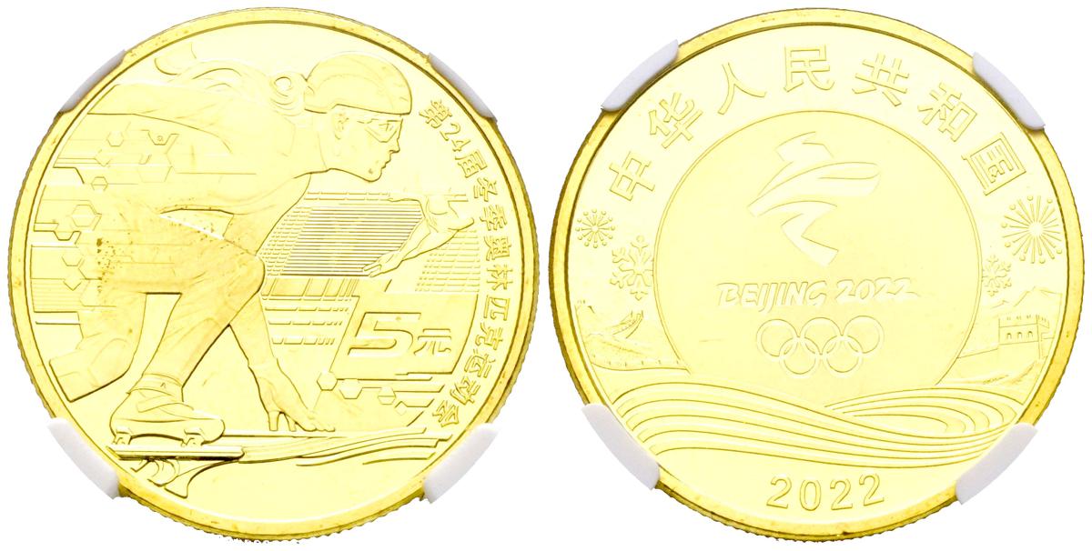 CHINA. 5 Yuan. (Bronce dorado. 13,00g/30mm). 2022. Juegos Olímpicos de Invierno, "Speed Skiing". Encapsulado por NGC MS-69PL.