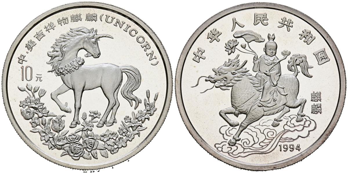 CHINA. 10 Yuan (Ar. 31,03g/40mm). 1994. Unicorn. (Km#675). PROOF. Tirada de sólo 4000 unidades.