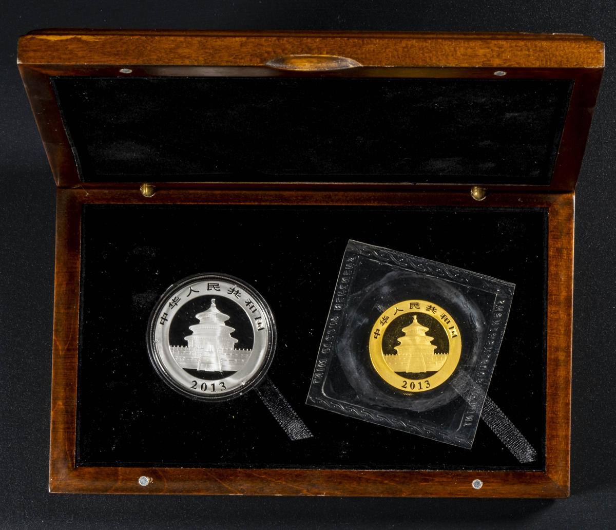 CHINA. Serie Panda. Pareja de monedas de 10 Yuan (Ar.31,08g/40mm) y 500 Yuan (Au. 31,10g/32mm). 2013. PROOF. Presentadas en en estuche de madera. La pieza de oro se encuentra precintada en su blister original.