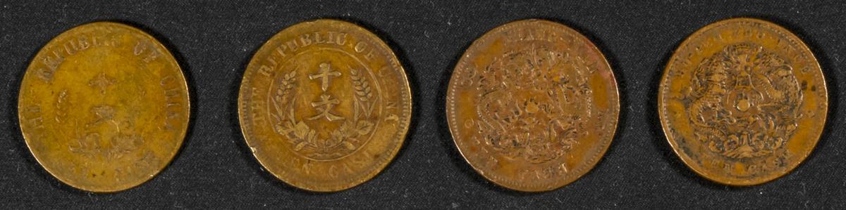 CHINA. Conjunto de 4 monedas de 10 Cash con diferentes fechas (principios del siglo XX) y estados de conservación. A EXAMINAR.