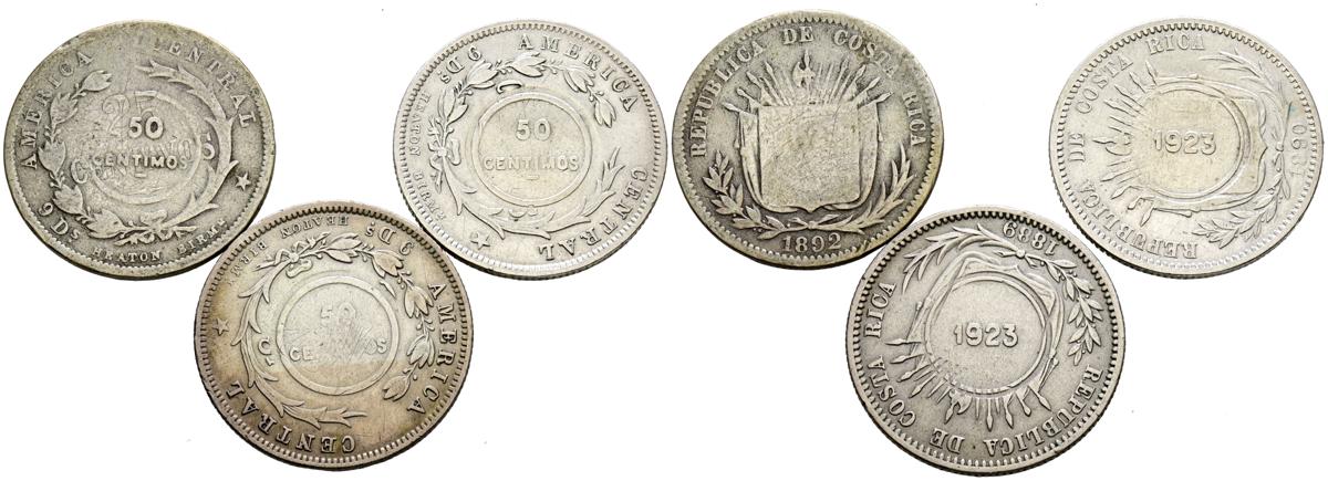 COSTA RICA. Interesante conjunto de 3 monedas de 50 Centimos acuñadas en 1889, 1890 y 1892. Las 3 piezas con contramarca de fecha 1923. Diferentes estados de conservación. A EXAMINAR.
