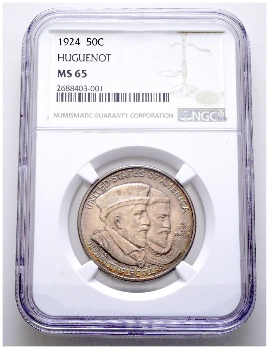 ESTADOS UNIDOS. 50 Cents. (Ar. 12,50g/31mm)*. 1924. III Centenario Huguenot-Walloon. (Km#154). Encapsulado por NGC MS 65. *Peso y medida teóricos. Escasa.