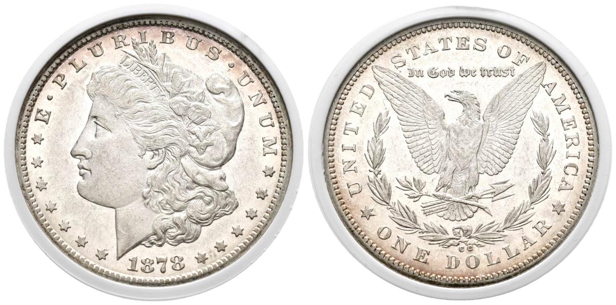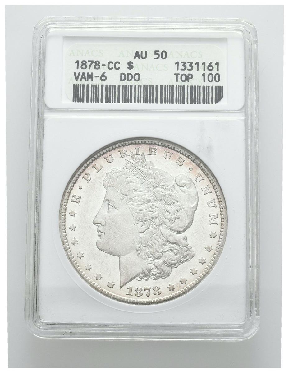 ESTADOS UNIDOS. 1 Dollar (Ar. 26,73g/38mm)*. 1878. Carson City CC. (Km#110). Encapsulado por ANACS AU50. VAM-6 DDO. TOP 100. *Peso y medida teórico.