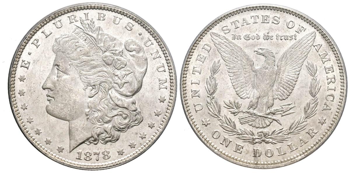 ESTADOS UNIDOS. 1 Dollar (Ar. 26,73g/38mm)*. 1878. Philadelphia. 7/8 TF. VAM-37. (Km#110). Encapsulado por ANACS MS62. *Peso y medida teórico.