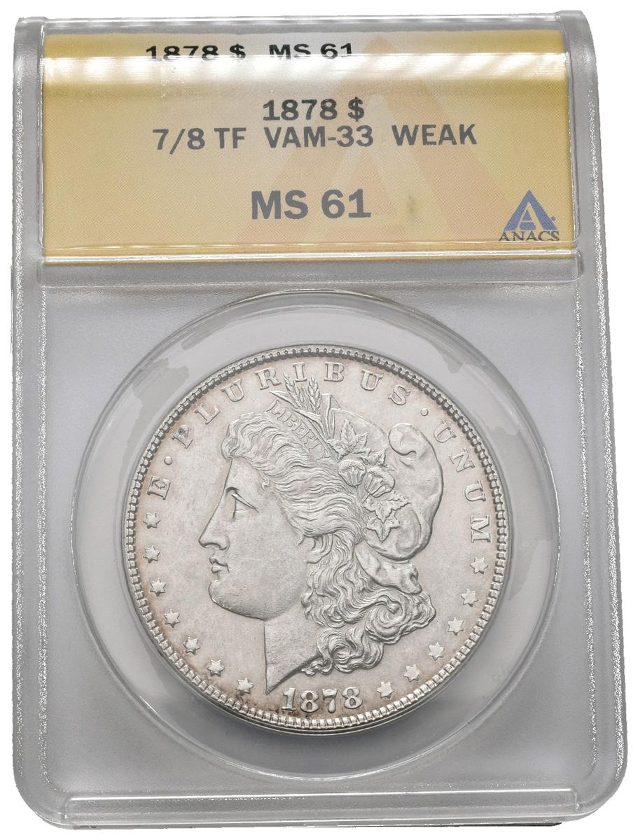 ESTADOS UNIDOS. 1 Dollar (Ar. 26,73g/38mm)*. 1878. Philadelphia. (Km#110). MS 61, 7/8 TF VAM-33 WEAK. Encapsulado por ANACS. *Peso y medida teórico.