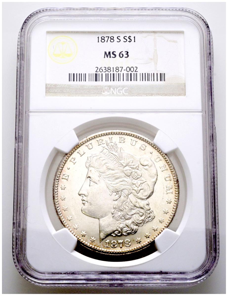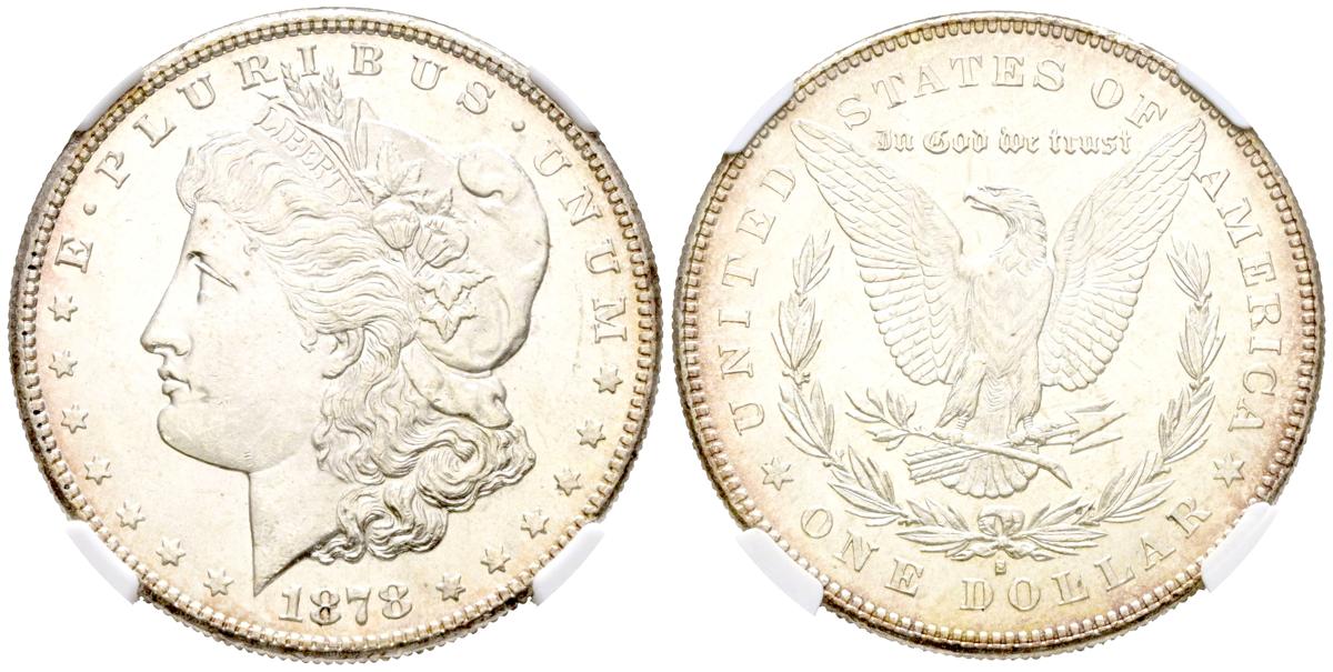 ESTADOS UNIDOS. 1 Dollar (Ar. 26,73g/38mm)*. 1878. San Francisco S (Km#110). Encapsulado por NGC MS63. *Peso y medida teórico.