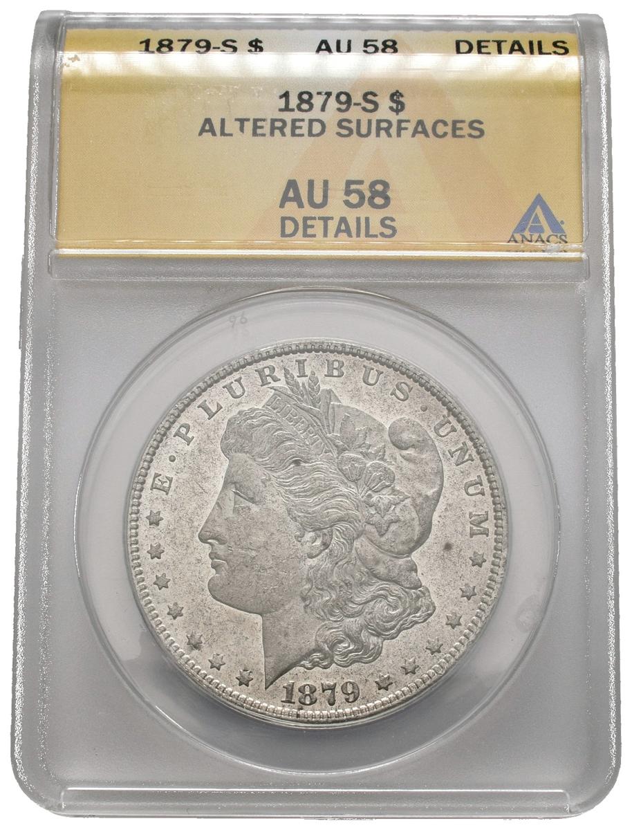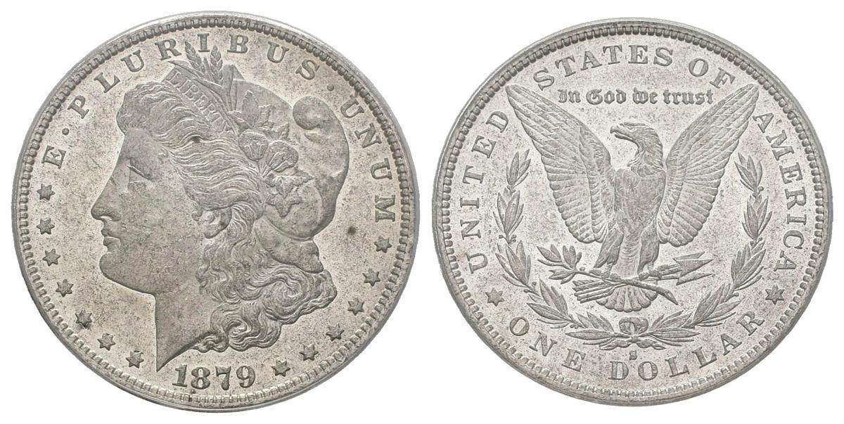 ESTADOS UNIDOS. 1 Dollar (Ar. 26,73g/38mm)*. 1879. San Francisco S. (Km#110). AU 58. Marquitas. Encapsulado por ANACS. *Peso y medida teórico.