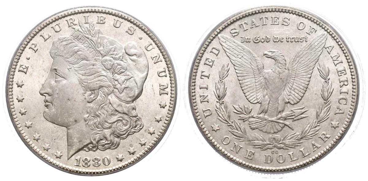 ESTADOS UNIDOS. 1 Dollar (Ar. 26,73g/38mm)*. 1880. Carson City CC. 8/Low 7. (Km#110). Encapsulado por PCGS MS65. *Peso y medida teórico.