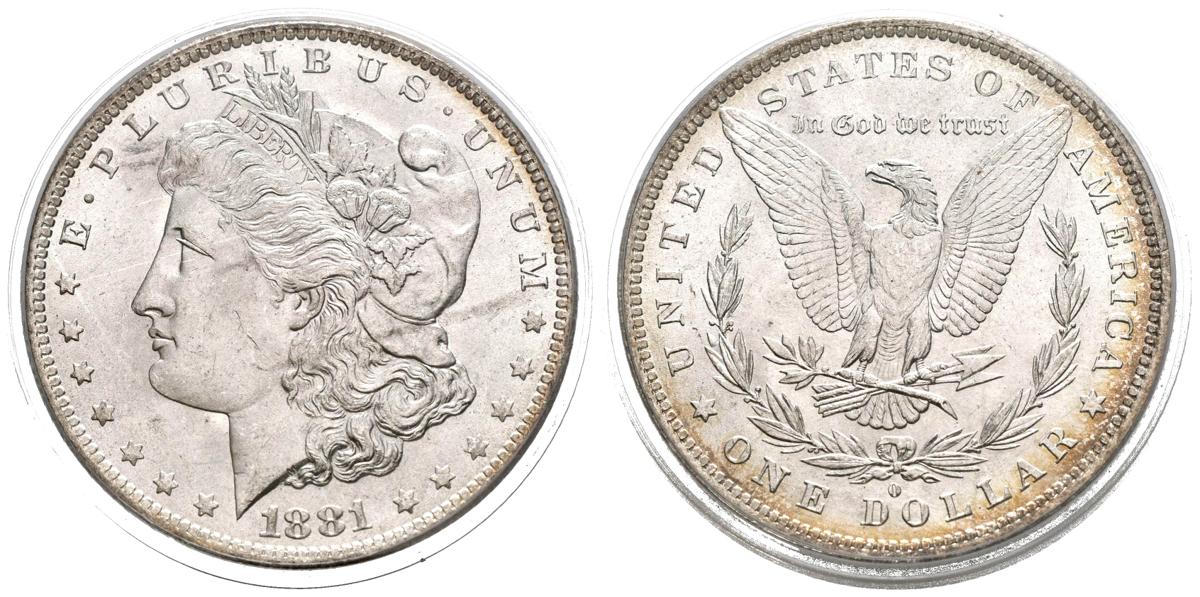 ESTADOS UNIDOS. 1 Dollar (Ar. 26,73g/38mm)*. 1881. Nueva Orleans O. (Km#110). Encapsulado por PCGS MS62. *Peso y medida teórico.