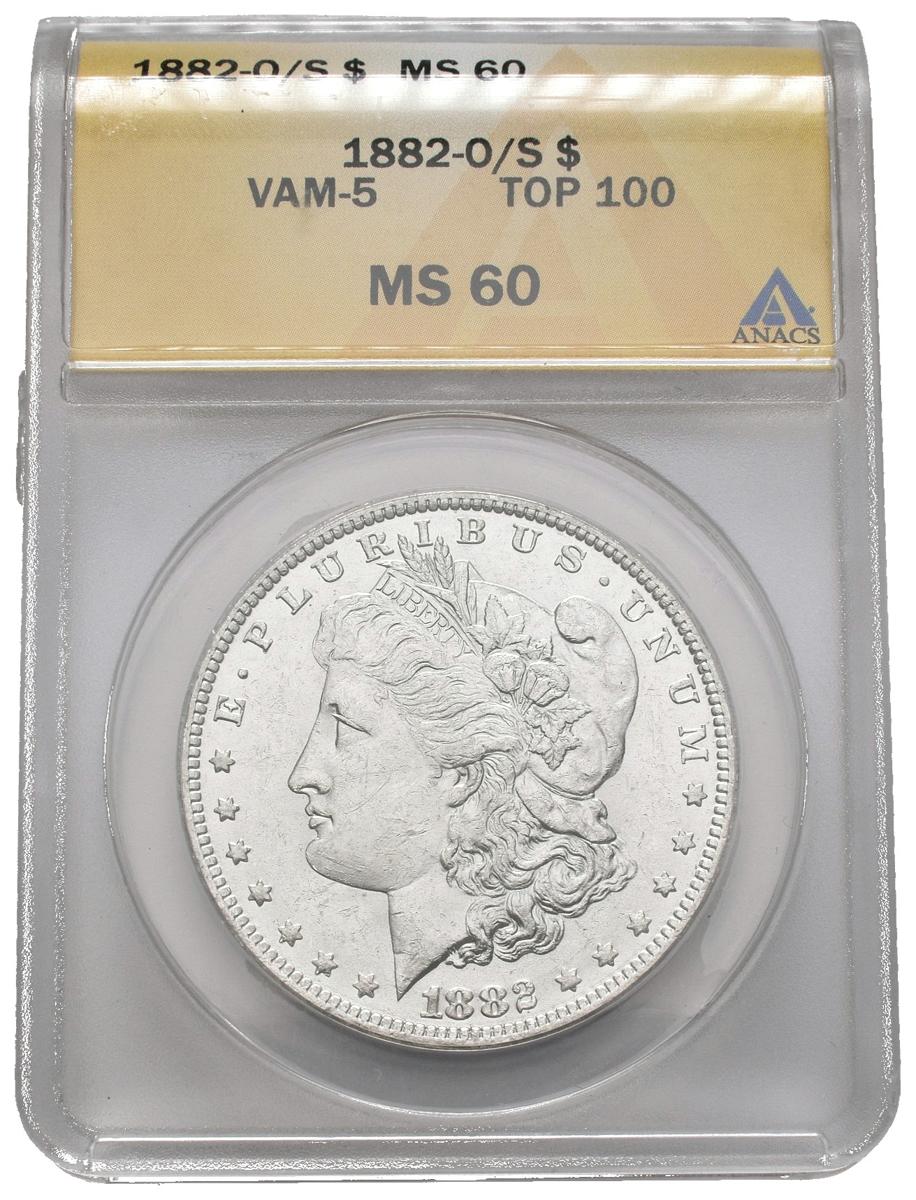 ESTADOS UNIDOS. 1 Dollar (Ar. 26,73g/38mm)*. 1882. Nueva Orleans/San Francisco O/S. (Km#110). MS 60, VAM-5 TOP 100. Encapsulado por ANACS. *Peso y medida teórico.