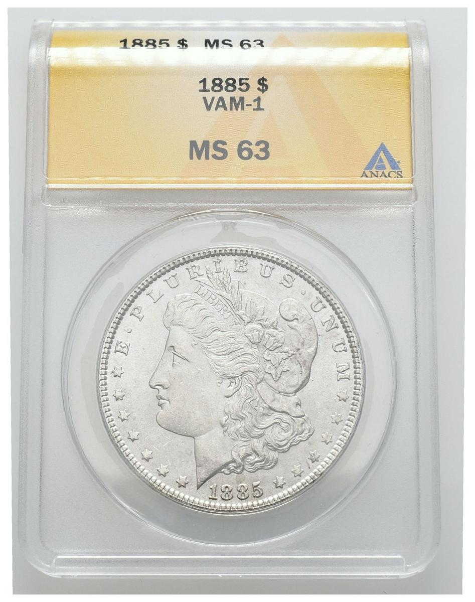 ESTADOS UNIDOS. 1 Dollar (Ar. 26,73g/38mm)*. 1885. Philadelphia. VAM-1. (Km#110). Encapsulado por ANACS MS63. *Peso y medida teórico.