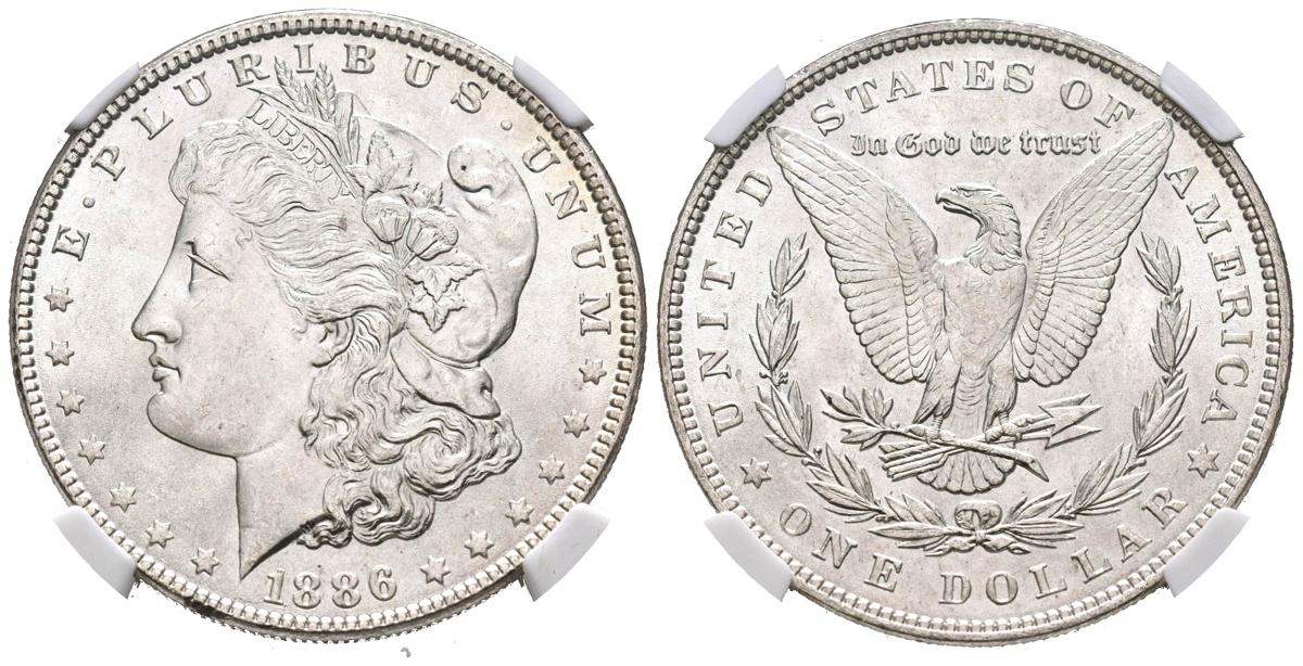 ESTADOS UNIDOS. 1 Dollar (Ar. 26,73g/38mm)*. 1886. Philadelphia. VAM-1 A Line in "6". TOP 100. (Km#110). Encapsulado por NGC MS66. *Peso y medida teórico.