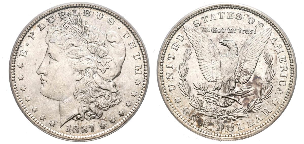 ESTADOS UNIDOS. 1 Dollar (Ar. 26,73g/38mm)*. 1887. Philadelphia. VAM-13. (Km#110). Encapsulado por ANACS MS63. *Peso y medida teórico.
