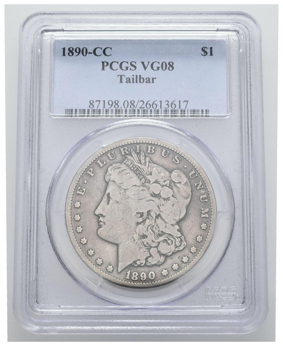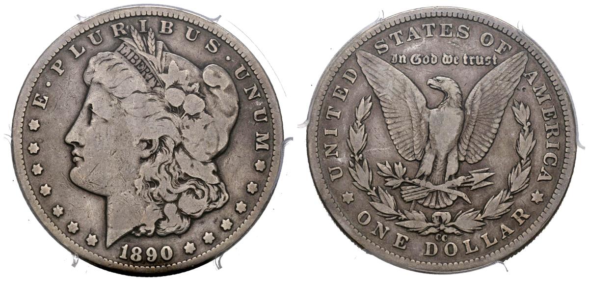 ESTADOS UNIDOS. 1 Dollar (Ar. 26,73g/38mm)*. 1890. Carson City CC. (Km#110). Tailbar. Encapsulado por PCGS VG08. *Peso y medida teórico.