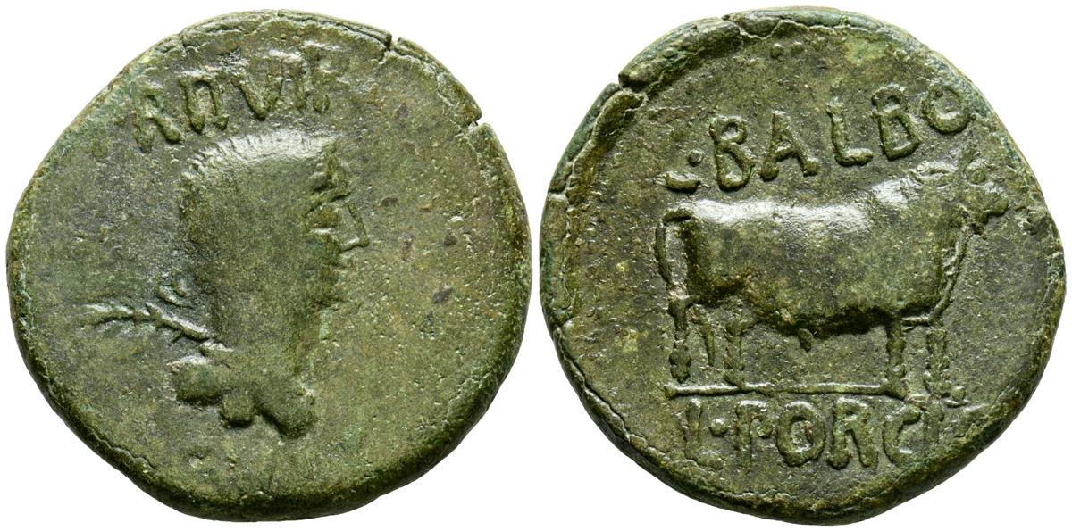 CELSE (Velilla del Ebro, Zaragoza). As. (Ae. 15,96g/31mm). 50-30 a.C. (FAB-800). Anv: Cabeza femenina a derecha, detrás palma, encima: PR. II. VIR., debajo: C.V.I.L. Rev: Toro a derecha, encima: C. BALBO, debajo: L. PORCIO. MBC-.
