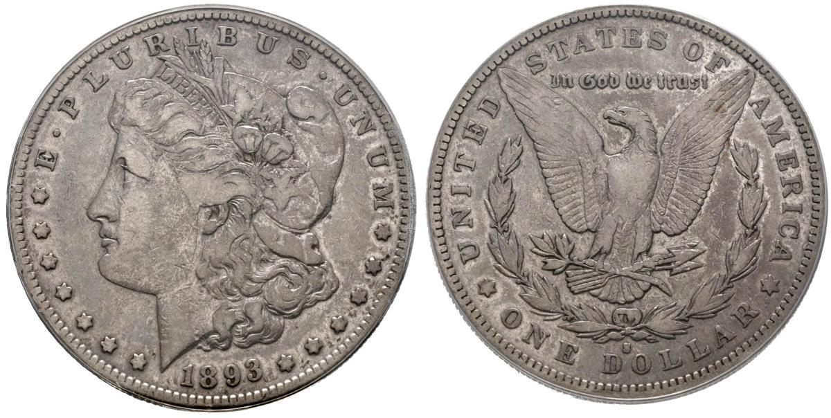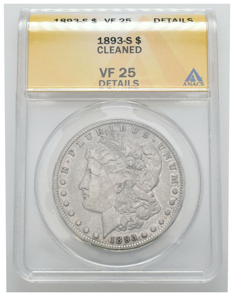 ESTADOS UNIDOS. 1 Dollar (Ar. 26,73g/38mm)*. 1893. San Francisco S. (Km#110). Limpiada. Encapsulado por ANACS VF25 Details. *Peso y medida teórico.