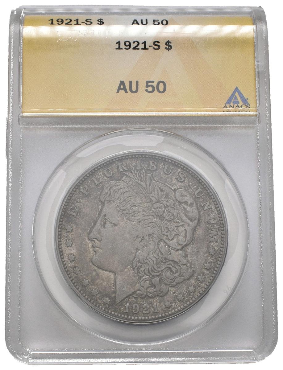 ESTADOS UNIDOS. 1 Dollar (Ar. 26,73g/38mm)*. 1921. San Francisco S. (Km#110). AU 50. Encapsulado por ANACS. *Peso y medida teórico.