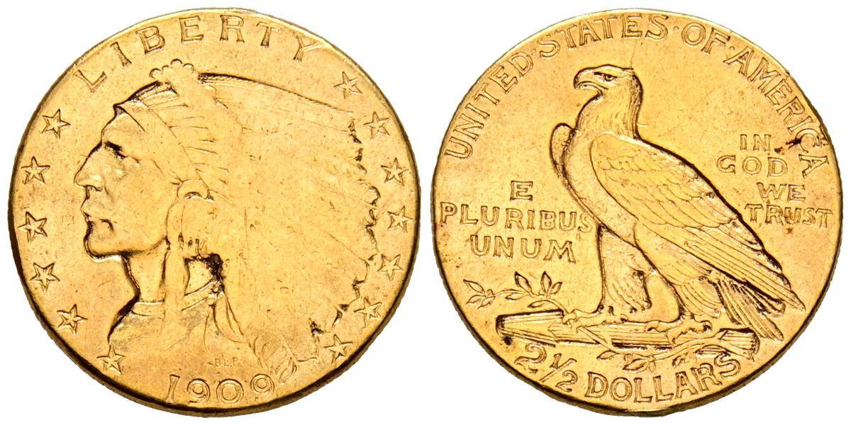 ESTADOS UNIDOS. 2 1/2 Dollars. (Au. 4,09g/17mm). 1909. Philadelphia. (Km#128). MBC-.