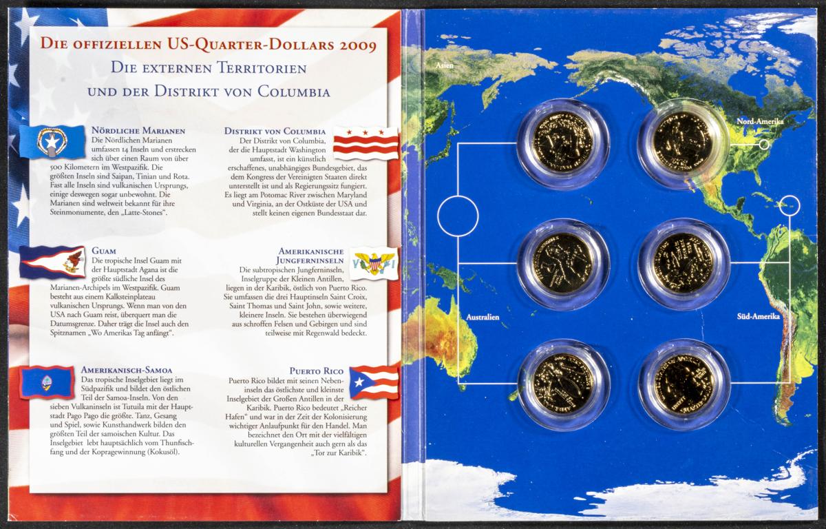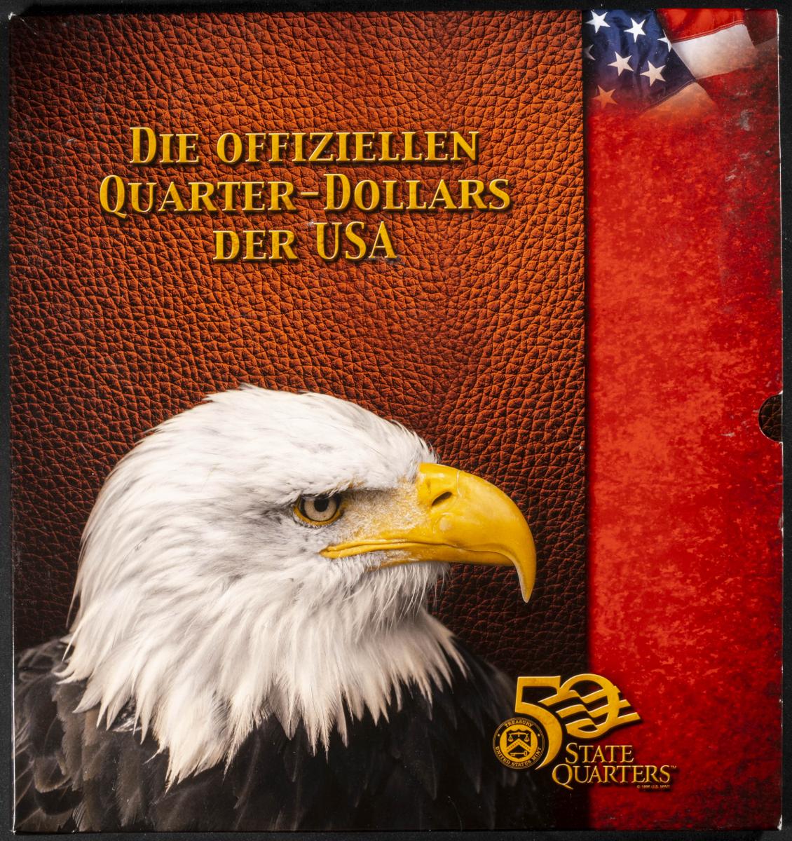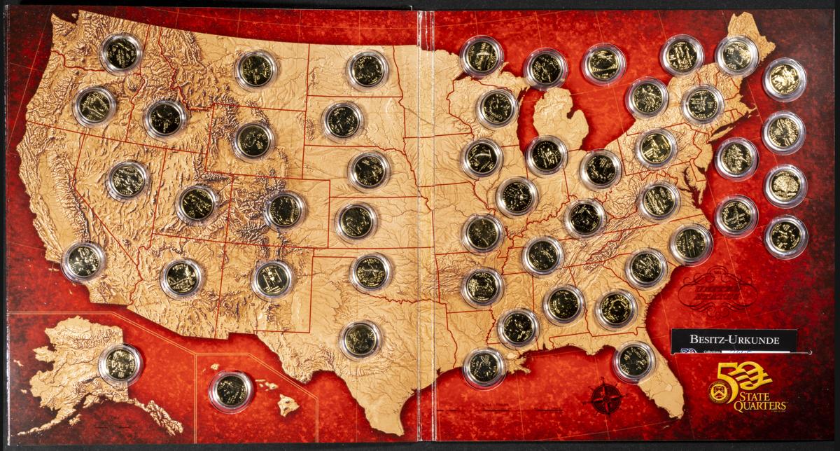 ESTADOS UNIDOS. Set de monedas emitido por el Departamento del Tesoro de la US Mint y compuesto por 56 monedas de Quarter Dollar con baño de oro (50 Estados+6 de Ultramar). Incluye certificado de autenticidad. Perfecto estado de conservación. A EXAMINAR.