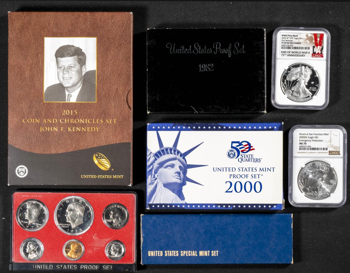 ESTADOS UNIDOS. Interesante conjunto formado por piezas encapsuladas y estuches conmemorativos emitidos desde finales del siglo XX hasta la actualidad. Destacan las monedas de 1 Dollar Proof conmemorativos del final de la II Guerra Mundial y la acuñación de emergencia de 2020. Magnífico nivel de conservación. A EXAMINAR.