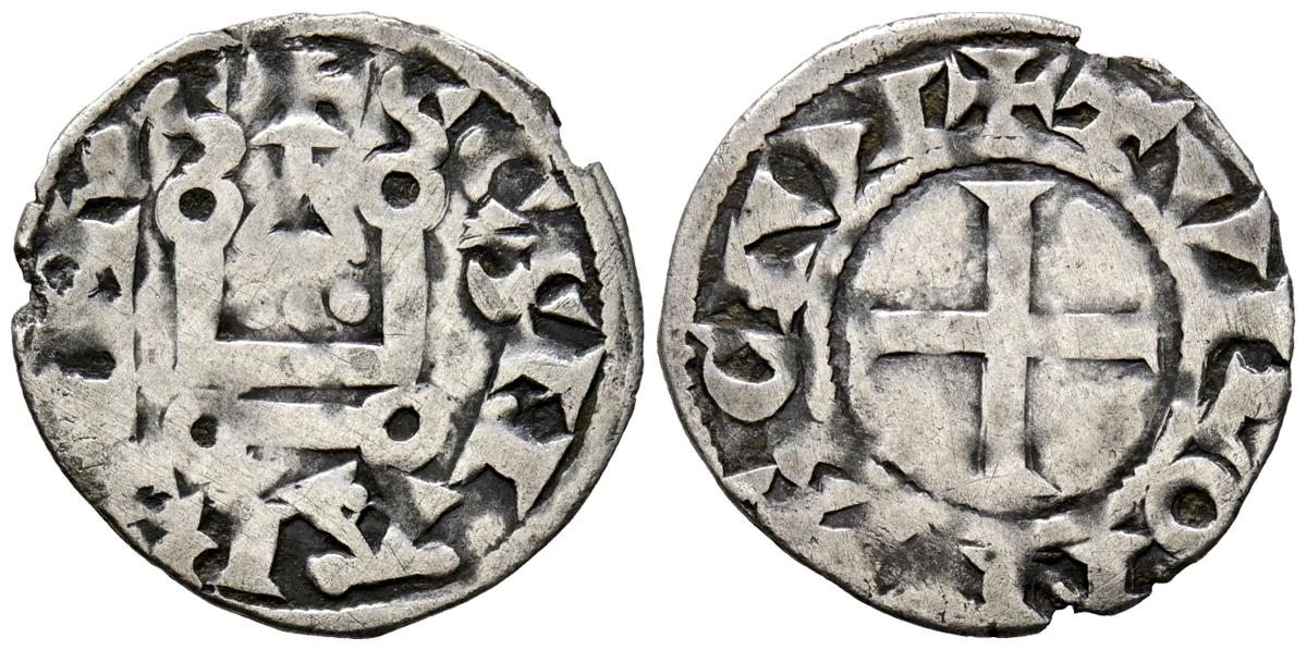 FRANCIA, San Martín de Tours. Dinero. (Ar. 0,90g/18mm). 1150-1200. Tournois. (Boudeau 185). Anv: Castillo, alrededor leyenda: SCS MARTINVS. Rev: Cruz dentro de gráfila, alrededor leyenda: TVRONIS CIVI. MBC-. Buen ejemplar.