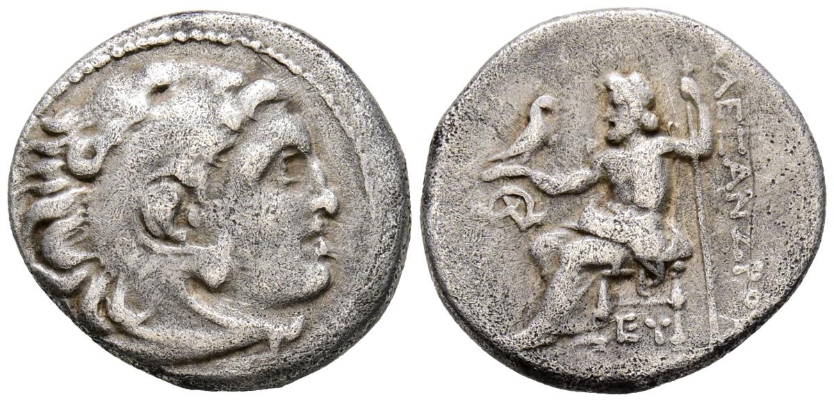 CARIA, Mylasa. Dracma. (Ar. 4,02g/17mm). 310-300 a.C. (Price 2479). Anv: Cabeza de Heracles con piel de león. Rev: Zeus sentado a izquierda portando cetro y águila, detrás leyenda griega, delante monograma y debajo del trono EY. MBC-.