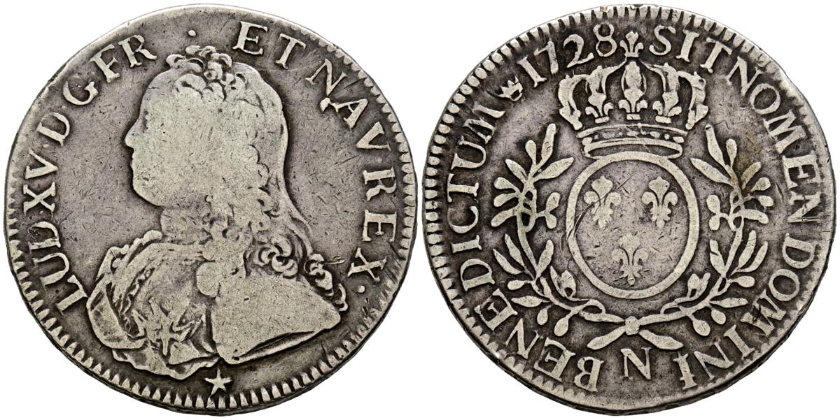 FRANCIA, Luis XV (1715-1774). Ecu. (Ar. 28,72g/41mm). 1728. Montpellier N. (Km#486; G. 321). BC+.
