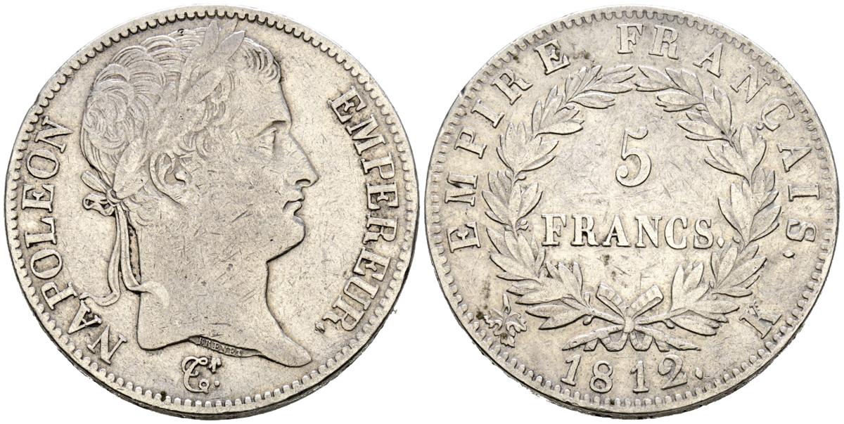 FRANCIA. 5 Francs. (Ar. 24,77/37mm). 1812. Napoléon. Imperio Francés. Burdeos K. (Km#694.8). MBC-.