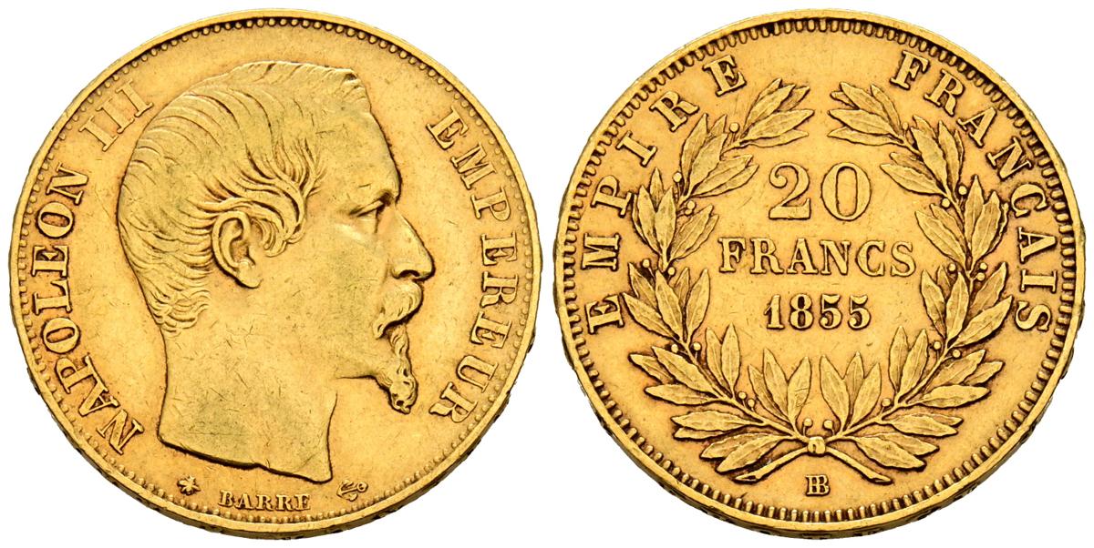 FRANCIA. 20 Francos. (Au. 6,39g/21mm). 1855. Estrasburgo BB. (Km#781.2). MBC.