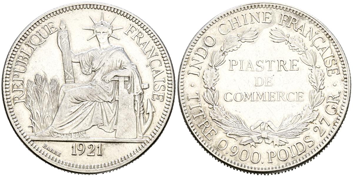 INDOCHINA FRANCESA. 1 Piastra (Ar. 26,94g/39mm). 1921. Sin marca de ceca. (Km#5a). MBC+. Limpiada.